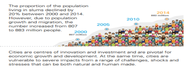 Tradução da Legenda: “A proporção da população que vive em favelas diminuiu 20% entre 2000 e 2014. No entanto, devido ao crescimento e migração da população, o número aumentou de 807 milhões para 883 milhões de pessoas. As cidades são centros de inovação e investimento e são essenciais para o crescimento econômico e para o desenvolvimento. Ao mesmo tempo, as cidades são vulneráveis a impactos severos, a uma série de desafios e choques que podem ser naturais ou causados pelo homem.”