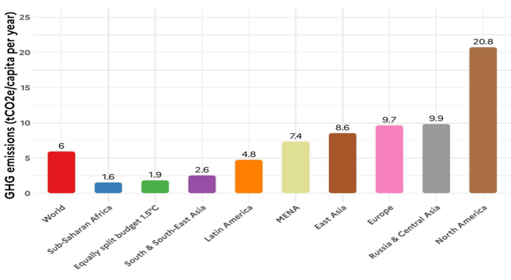 Notas: “Os níveis de emissão na maioria das regiões de renda alta e média excedem orçamentos igualmente divididos em várias ordens de magnitude.As emissões médias em algumas regiões do Sul Global estão em linha ou muito próximas dos orçamentos compatíveis com um cenário de apenas 1,5ºC. Os valores incluem emissões embutidas no comércio internacional, mas excluem uso da terra, mudança no uso da terra e silvicultura”. Fonte: Chancel, 2022.