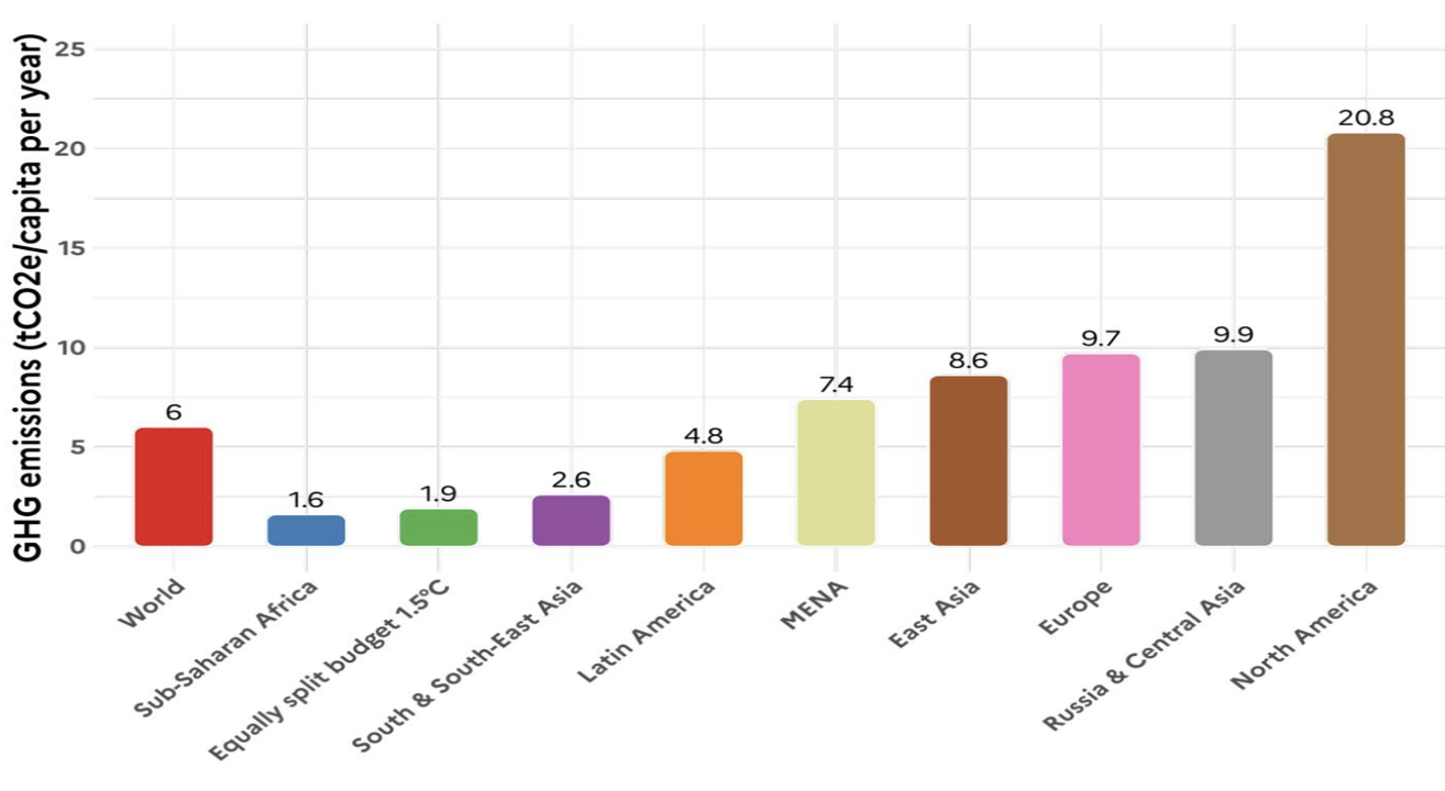 Notas: “Os níveis de emissão na maioria das regiões de renda alta e média excedem orçamentos igualmente divididos em várias ordens de magnitude.As emissões médias em algumas regiões do Sul Global estão em linha ou muito próximas dos orçamentos compatíveis com um cenário de apenas 1,5ºC. Os valores incluem emissões embutidas no comércio internacional, mas excluem uso da terra, mudança no uso da terra e silvicultura”. Fonte: Chancel, 2022.