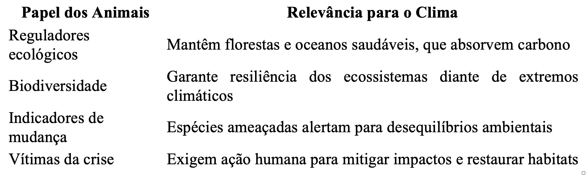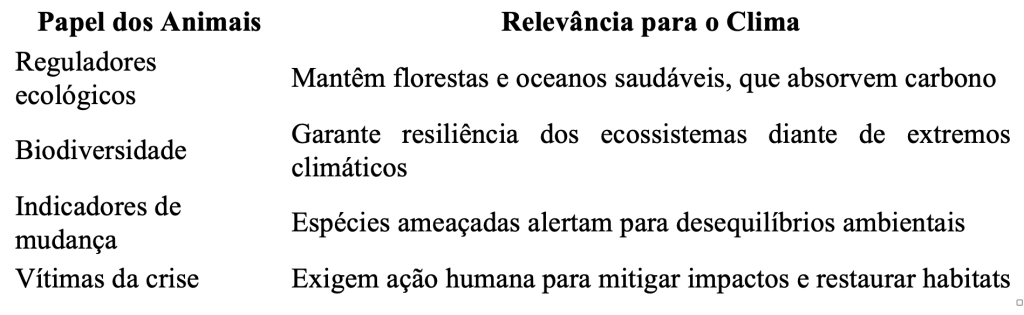 O quadro abaixo é um resumo do porquê os animais importam nas mudanças climáticas:
